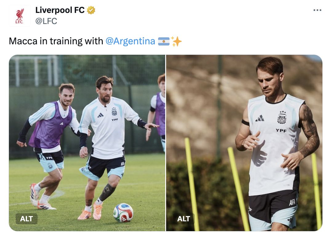 利物浦官推晒麦卡国家队练习照,梅西入镜遭球迷调侃