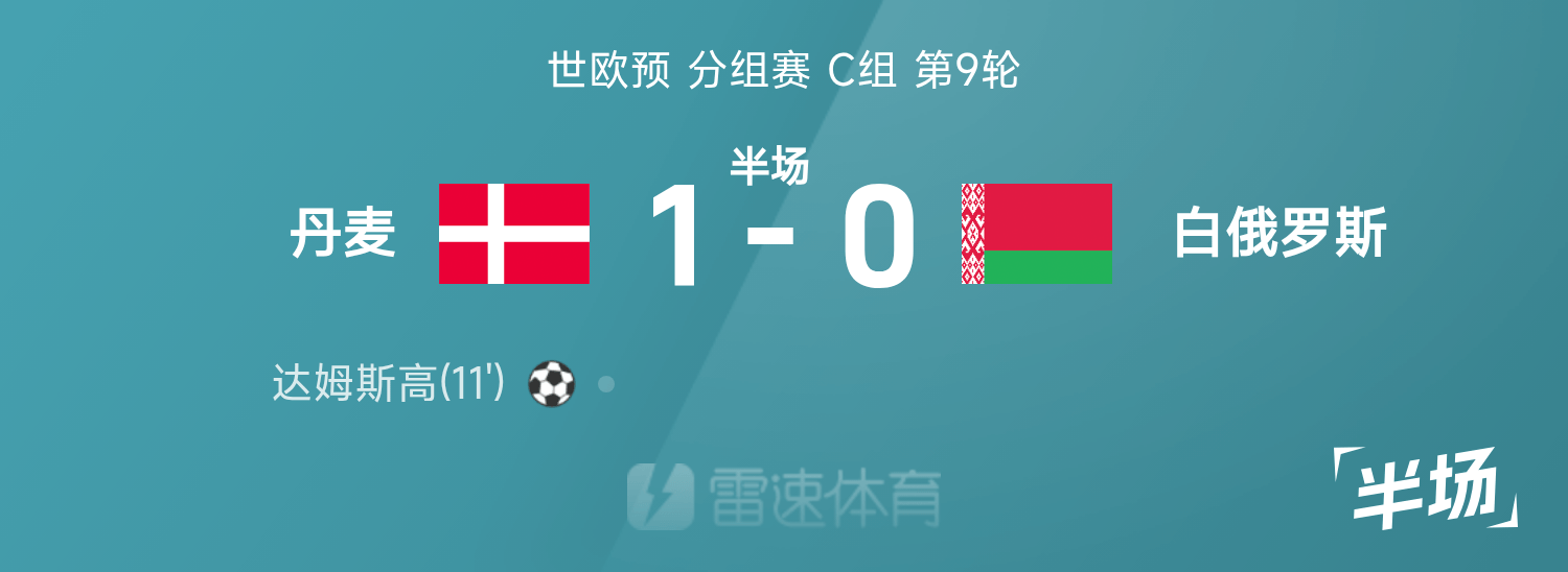 世欧预半场:达姆斯高世界波破僵,丹麦暂1-0白俄罗斯