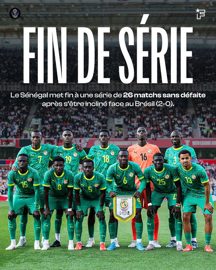 塞内加尔26场不败纪录遭巴西终结,上场输球是23年9月