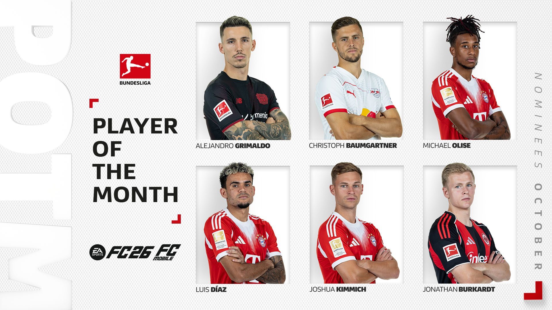 6686体育app11月7日讯 德甲官方公布了十月份联赛事最佳球员,法兰克福前锋伯克特力压拜仁前锋迪亚斯和药厂队长格里马尔多当选。