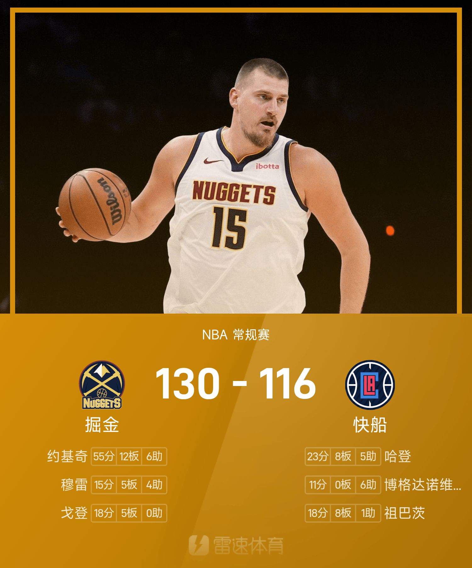 NBA战报:约基奇55分12板6助,掘金130-116击败快船