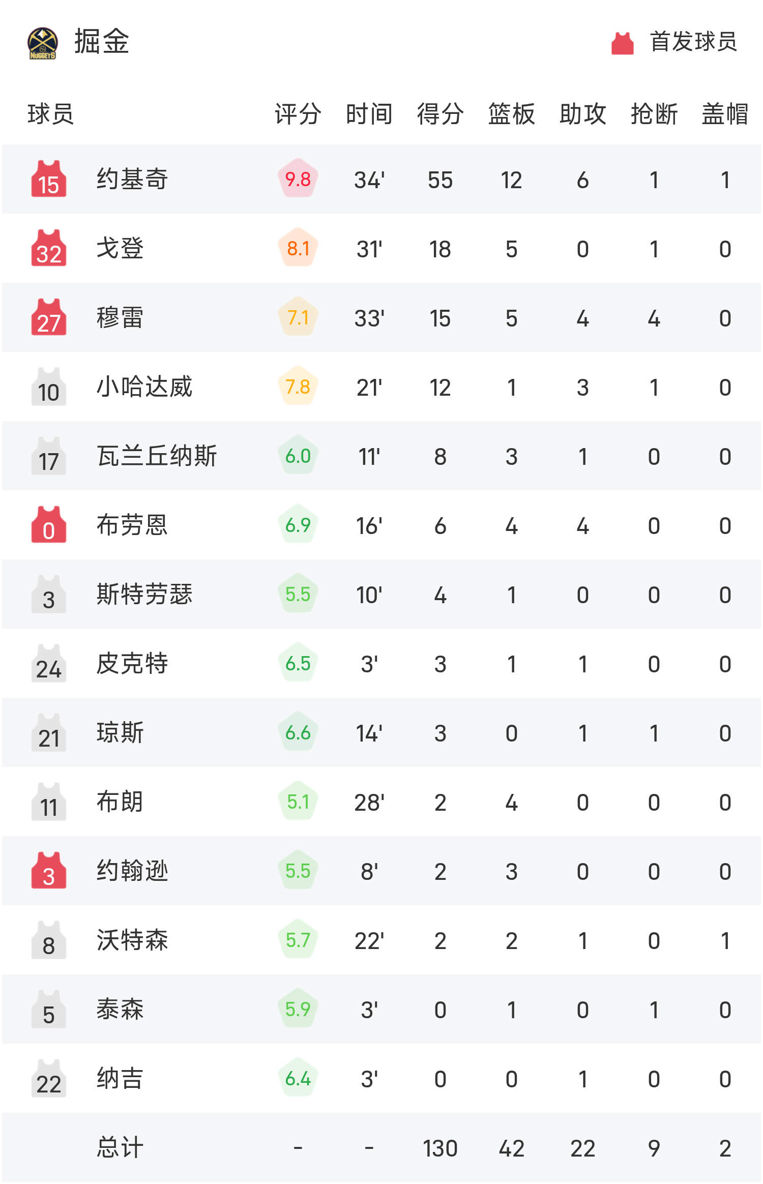 约基奇砍下全场最高的55分12板6助,率领掘金胜利取胜。