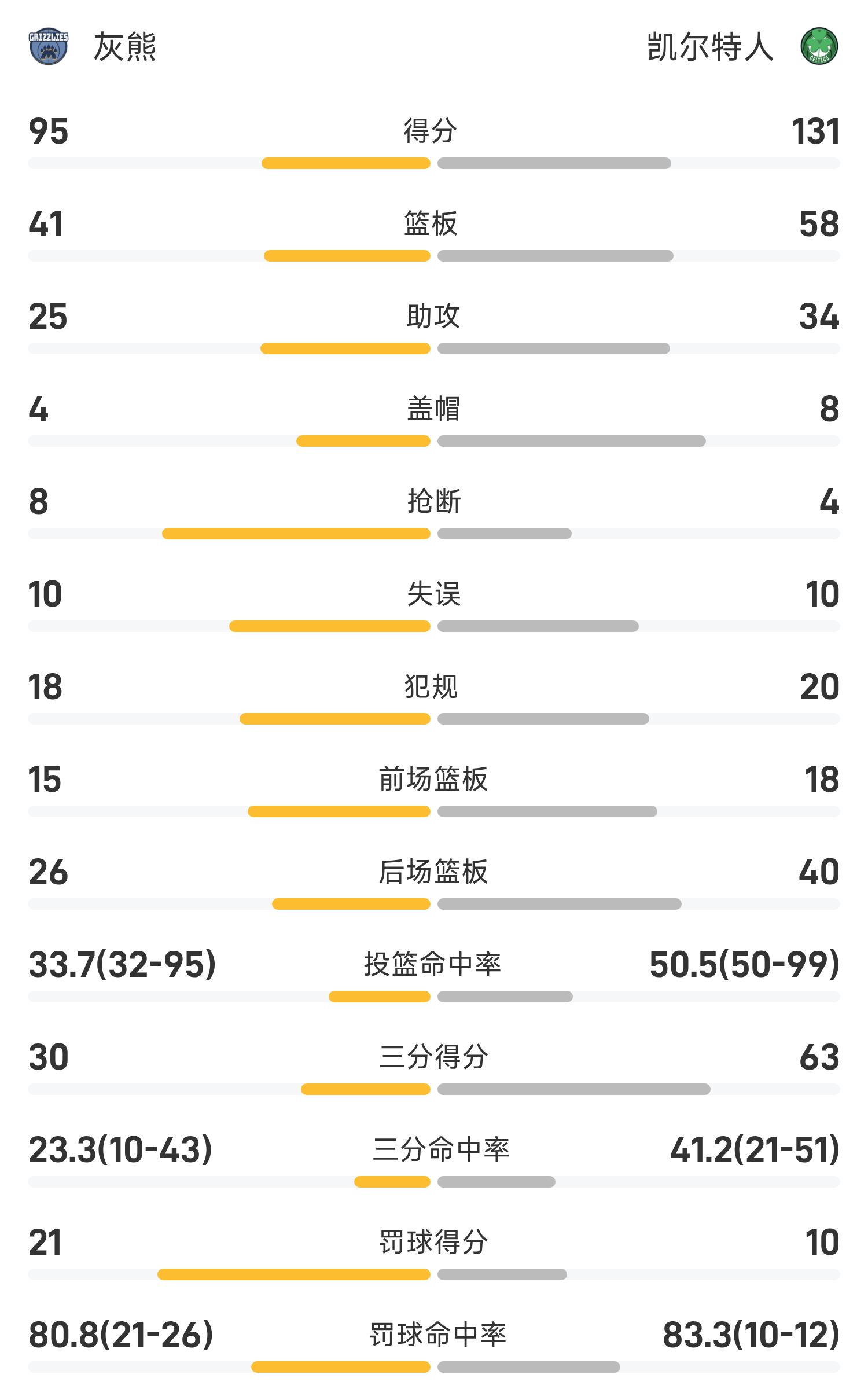 双方全场战罢,凯尔特人131-95战胜灰熊。