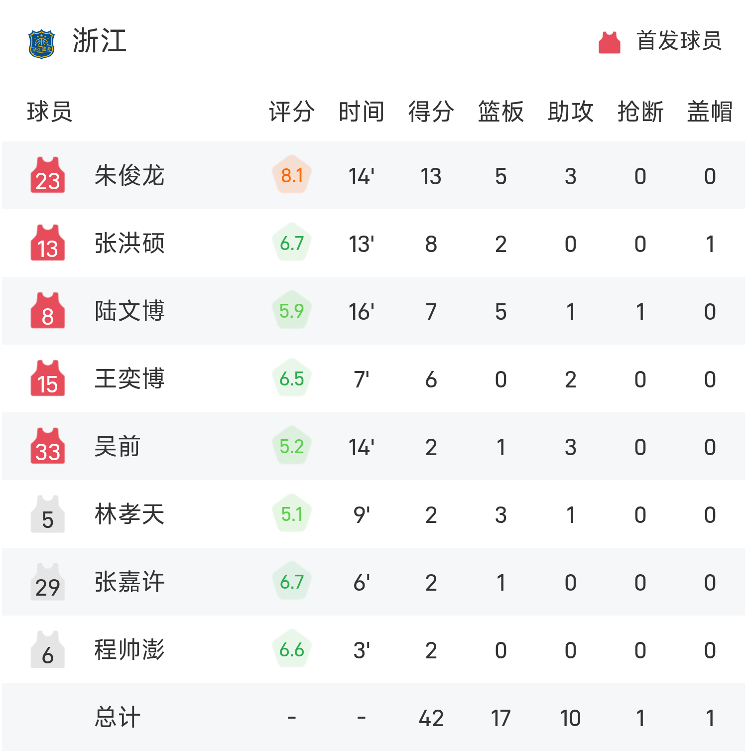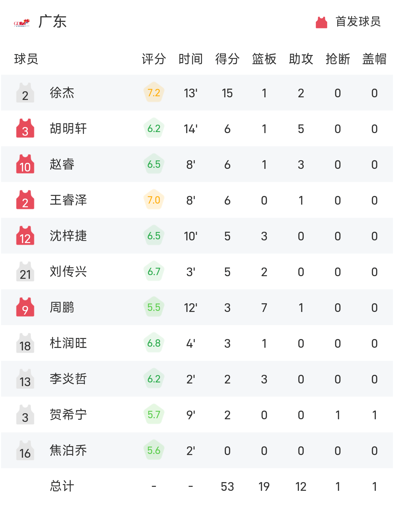 广东后备队员球员徐杰得到15分1板2助,浙江首发前锋朱俊龙得到全队最高的13分5板3助。