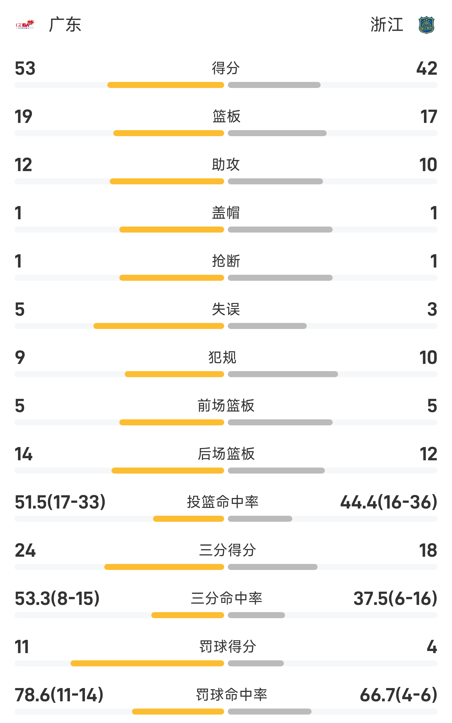 双方目前半场战罢,浙江42-53跟跑位广东。