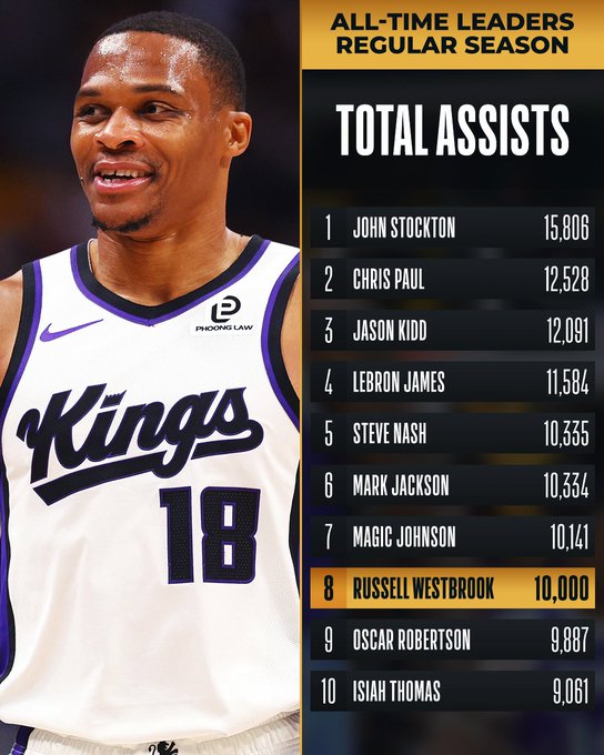 目前,国王球员威少已达成生涯10000次助攻的成就,这是NBA历史第八名达此数据的球员。