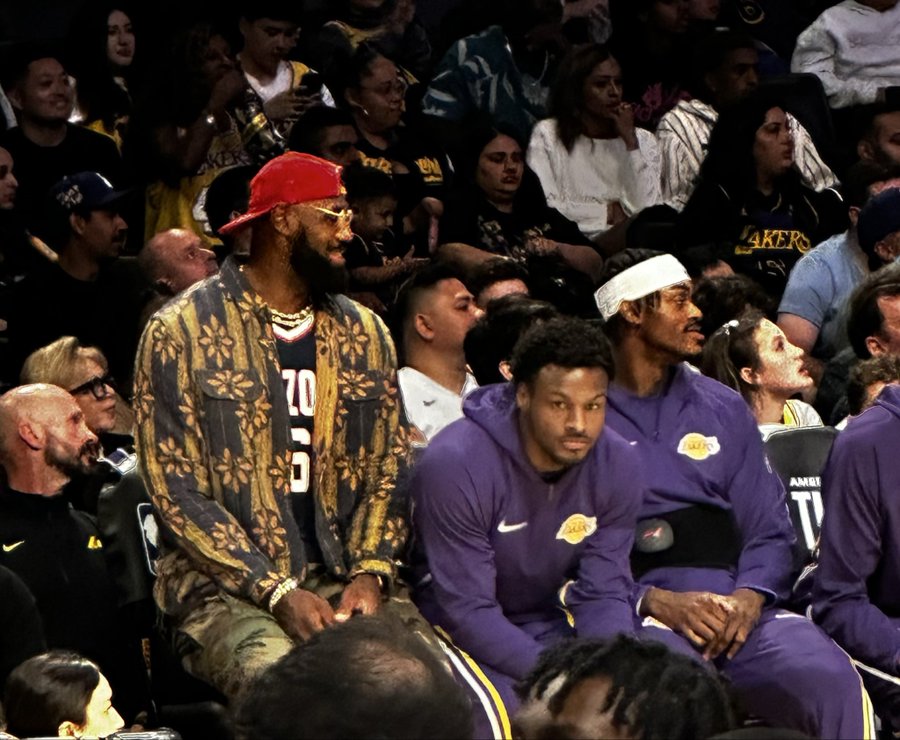 湖人记者分享现场照片,勒布朗出穿着小儿子布莱斯在亚利桑那州立大学的队服坐在场边观战,大儿子布朗尼坐在他的旁边。
